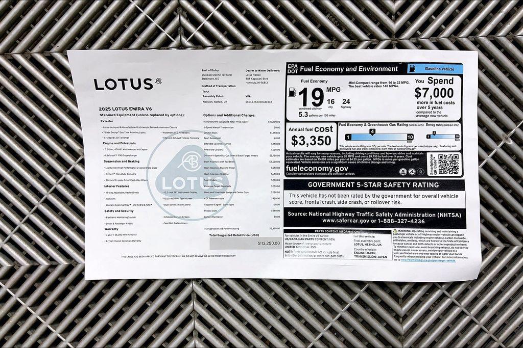 Cosmos Black 2025 Lotus Emira V6 RWD 6-Speed Manual V6 Supercharged Black Alcantara Headliner, Black Alcantara Steering Wheel, Extended Lower Black Pack, Privacy Glass, Red Brake Calipers, Sports Pedals, Sports Suspension.Mainland Buyer? Shipping Made Easy! Ask About Kama'aina pricing and Special shipping to Neighbor islands. Velocity Honolulu proudly presents this outstanding 2025 Lotus Emira, finished in Cosmos Black with a Black interior and loaded with premium features. Nationwide delivery available—seamless, secure, and hassle-free.JN Group ""Where Your Experience Matters""