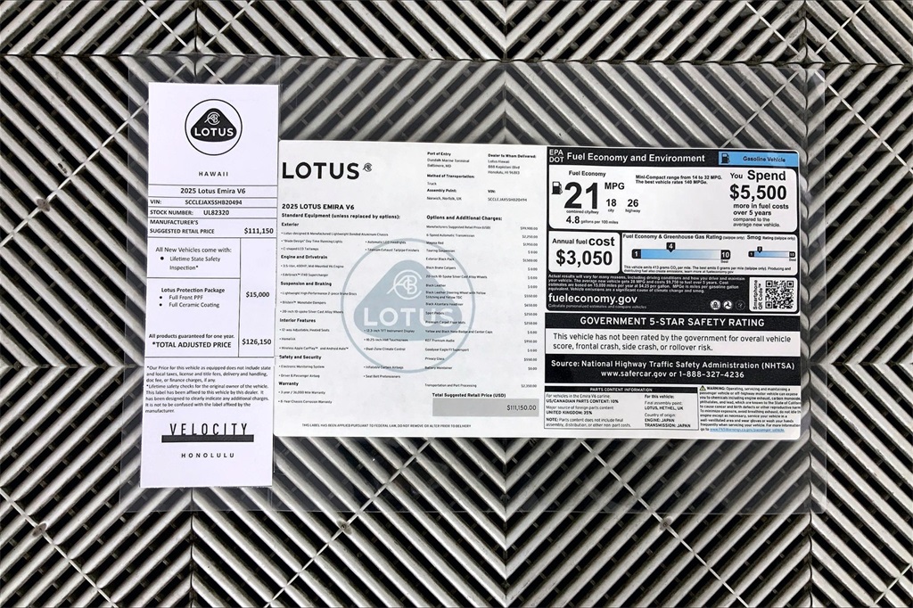 Magma Red 2025 Lotus Emira RWD 6-Speed Automatic V6 Supercharged Black Alcantara Headliner, Black Alcantara Steering Wheel w/Contrast Stitching, Full Black Pack, Privacy Glass, Radio: KEF Premium Audio (560w), Sports Pedals, Tour Suspension w/Goodyear Eagle F1 Supersport Tires, Wheels: 20"" Lightweight 10-Spoke Silver.Mainland Buyer? Shipping Made Easy! Ask About Kama'aina pricing and Special shipping to Neighbor islands. Velocity Honolulu proudly presents this outstanding 2025 Lotus Emira, finished in Magma Red with a Black interior and loaded with premium features. Nationwide delivery available—seamless, secure, and hassle-free.JN Group ""Where Your Experience Matters""